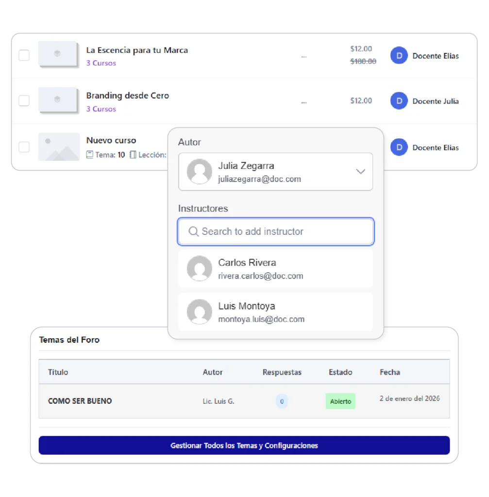 Administra instructores, roles y estudiantes desde un entorno controlado, permitiendo asignaciones claras, seguimiento y orden en cada curso.